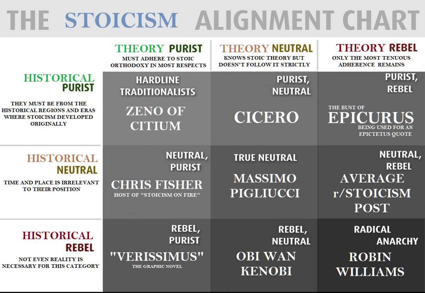 For example - the Stoicism alignment chart below (not my own) shows some ways you might think about defining who does or doesn’t count as a Stoic. Cicero is from the right time, but his beliefs are a bit off. Chris Fisher - host of the “Stoicism on Fire” Podcast is a theory purist, but he was born 2000 years after Marcus Aurelius. The more to the top left you are - the more hardcore your definition. The more to the bottom right, the more lenient and inclusive.